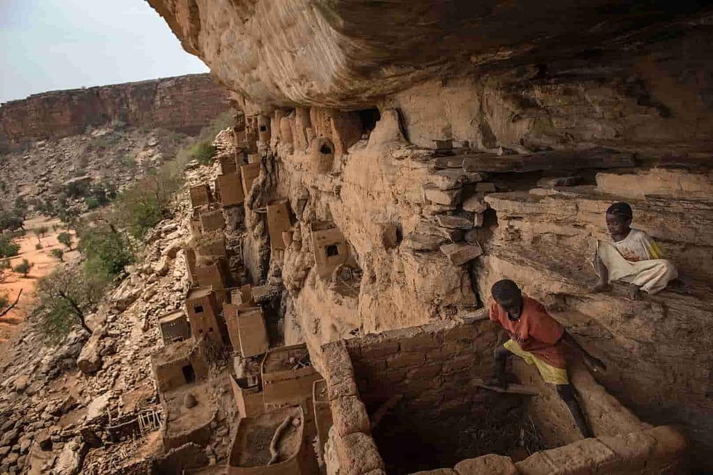 Los Dogón se asentaron en Malí sobre la pared de un acantilado, falla o escarpa del terreno, que aunque signifiquen lo mismo, cada traductor gusta de exponerlo de una manera, o de todas, en los diversos estudios, conocida como Bandiangara.
