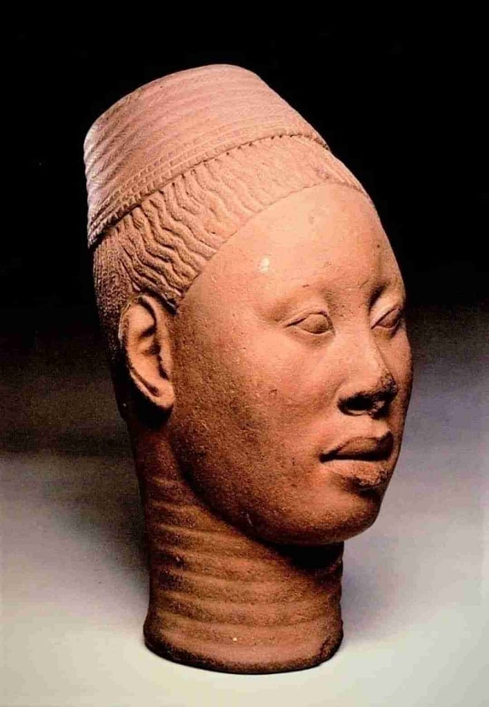 “Varias cabezas de terracota de la Era Floreciente de Ife, aproximadamente el 5 por ciento del total, muestran tres marcas faciales elípticas de ‘bigote de gato’ en las comisuras de la boca, similares a las que se asocian con los Yagba Yoruba, un grupo que hace tiempo se asentó al noreste, y que más tarde se asimiló con los Nupe. En una de esas esculturas, las marcas se extienden hacia las mejillas de una manera similar a las marcas faciales posteriores de los Yoruba Abaja, lo que indica una conexión histórica entre las dos”.
