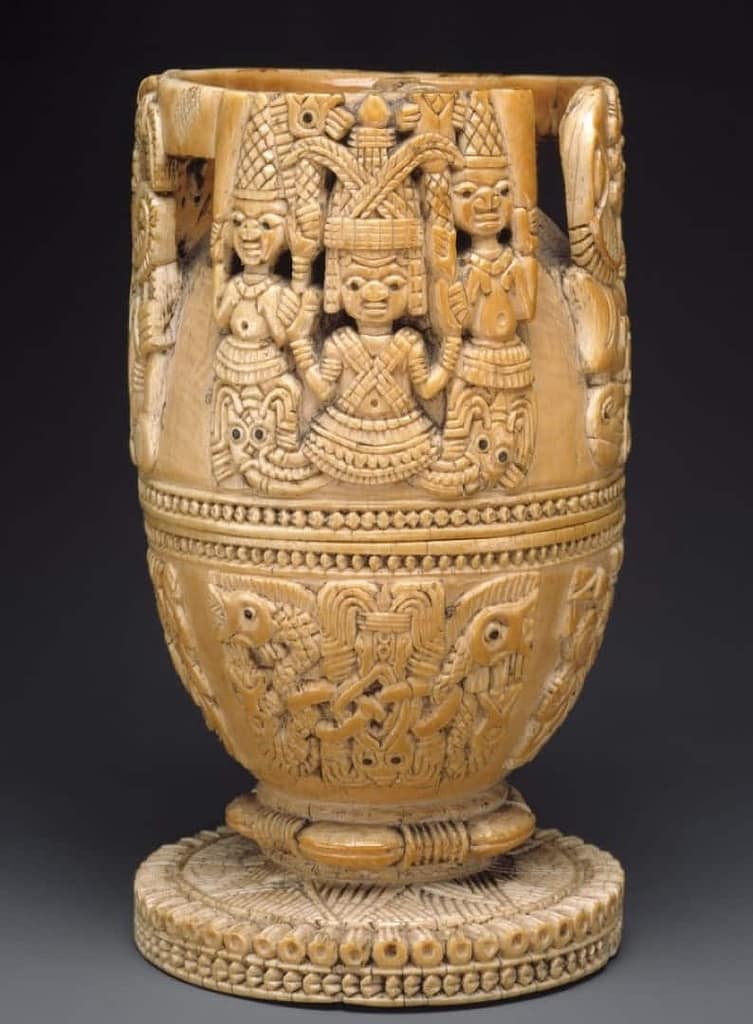 “Este espectacular recipiente de marfil fue una vez la posesión atesorada de un olowo, el gobernante del reino yoruba de Owo en el actual sur de Nigeria. Owo saltó a la fama regional en el siglo XVIII a través del comercio y la conquista, y se convirtió en uno de los estados más grandes de África occidental en ese momento. Tenía estrechos lazos políticos con el reino de Benin, a unas setenta millas al sureste. Gran parte de la cultura cortesana de Owo, incluidos títulos, disfraces y esculturas de prestigio, reflejan una estrecha asociación entre los dos importantes centros políticos y culturales.