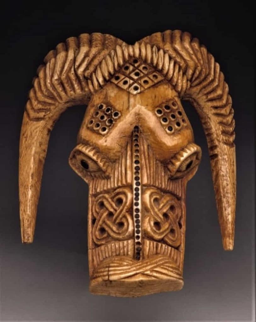 Si bien el hocico está dominado por surcos lineales y nudos de quatrifolio, motivo utilizado ampliamente en el arte yoruba, la frente presenta amplios pasajes de superficie plana interrumpida por diamantes con cuadrados y círculos. La interacción de las superficies opuestas continúa extendida a lo largo de los cuernos que enmarcan la cara del carnero. Las crestas profundas en la base de los cuernos equilibran la frente lisa, mientras que las puntas sin adornos compensan los elaborados motivos del hocico”.