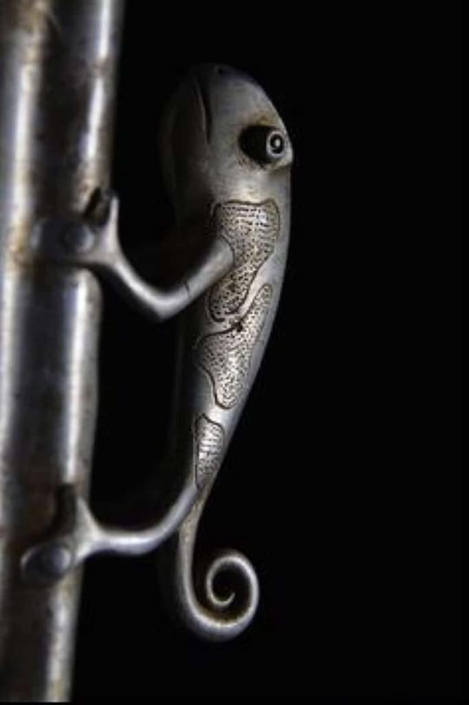 Bastones en el que en uno vemos el control, la eficiencia y paciencia del camaleón y en el otro un exclusivo y fantasioso animal, simbiosis de todo lo peligroso y con poderosa cabeza armada de puntiaguda cresta por un lado y al otro una temible bola.