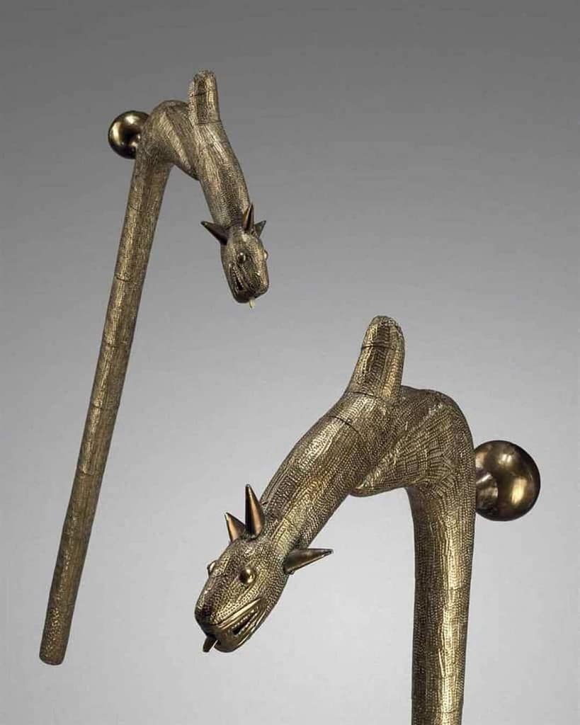 Este y otros objetos rituales, conocidos como makpo y depositados en conocidos museos, como el hacha de más abajo, que además de poderosa arma de combate tiene características estéticas similares a los emblemas de los Oba yoruba, mas la simbología de Hevioso, lo que habla de la alcurnia del propietario y su protocolo ritual; o los bastones maza, tan peligroso y destructivos como minuciosa y bellamente trabajados.