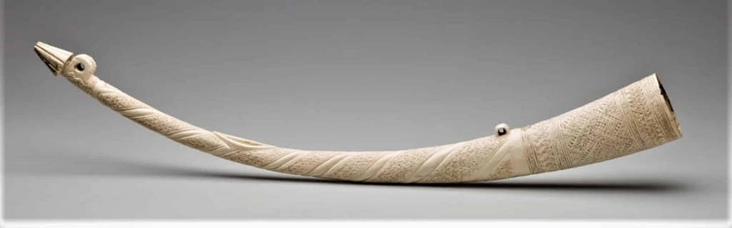 En esta trompa u oliphante tallada de una pieza en el colmillo de un elefante, vemos los engarces de dónde colgar la cuerda y la boquilla de insuflar el aire, calculada a una altura donde el sonido sea el deseado y previo el vaciado del marfíl macizo; es sin duda un trabajo de una técnica y refinamiento que para nada tiene que envidiar a cualquier trabajo de los marfiles que en la misma época podían verse en oriente o Europa como las del fastuoso Justus Glesker. Pensando además que en él y en lo que a simple vista parecen ornatos, se relata la ascendencia y casi vida del individuo o ente a quien iba dedicada.