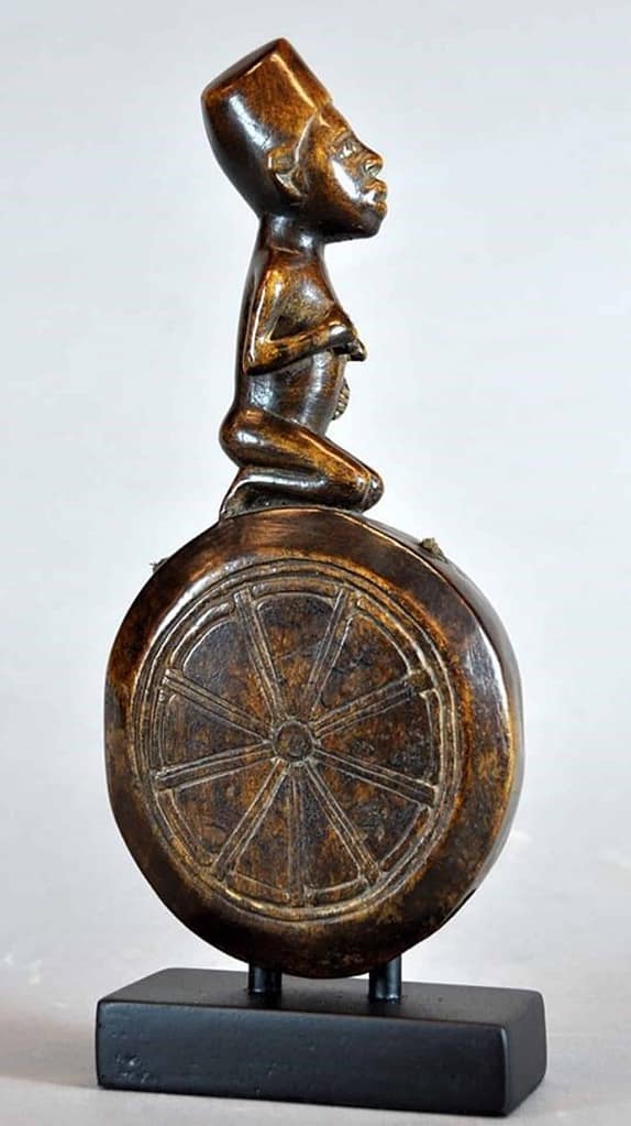 Eran también reconocidos los cetros con figuras genuflexas en señal de sumisión, o como vemos en el espantamoscas, con la mujer atada con las manos en la espalda, como hemos explicado antes, bien por haber cometido adulterio o por haber sido la mujer de un rey o jefe vencido.