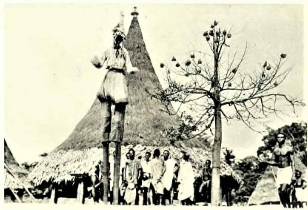 Kpa lu ge. “Demonio de patas largas”. Camina sobre zancos de hasta 3,5 ms de alto. Es bailarín y animador profesional como los dos anteriores. Tiene una ‘cara’, máscara, muy fina, tejida con rafia. No es un diablo de los Mano, pero puede vérsele bailar ahí, aún hoy, llegado de otro ‘país’.