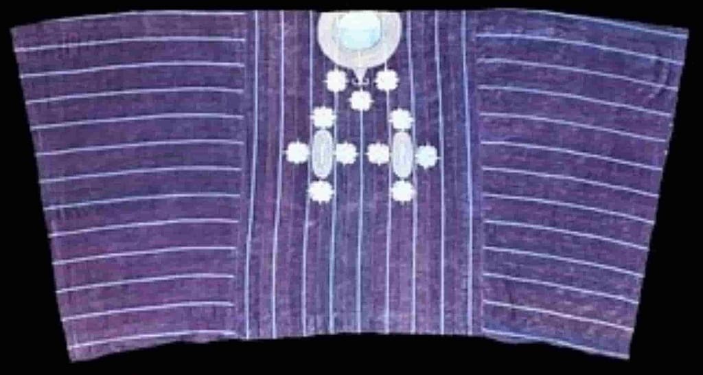 Y si esto ya en sí da idea de su valor por el material empleado, habría que incluir que en su técnica de hilado también se aprecia la exquisitez descrita pues el patrón conseguido con la seda Alaari de líneas de trazo más grueso forma el patrón Petuje. Lo que convierte a esta túnica de hombre en una pieza única, creada alrededor de 1900 que mide 126 cm de largo por 260 cm de ancho.