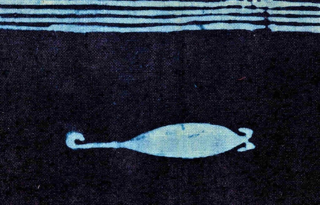 Detalle central de un Adire Eleko pintado a mano trabajado con almidón.