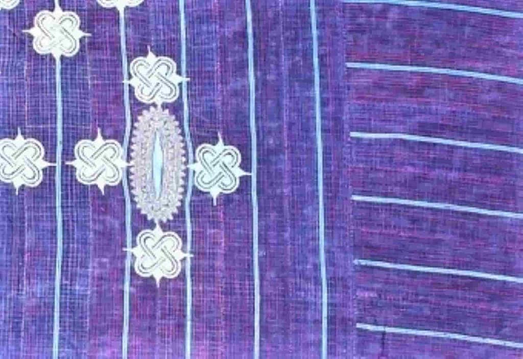 La túnica que vemos y el detalle del delicado bordado, es un compendio de tres de los textiles que se han explicado, pues las tiras de algodón más claro que se contraponen al tono índigo más oscuro de las bandas que forman el Etu, en este caso ha sido sustituida por la seda magenta Alaari, lo que habla del exquisito encargo que fue al aunar dos de los tres tejidos de más prestigio entre los Yoruba.