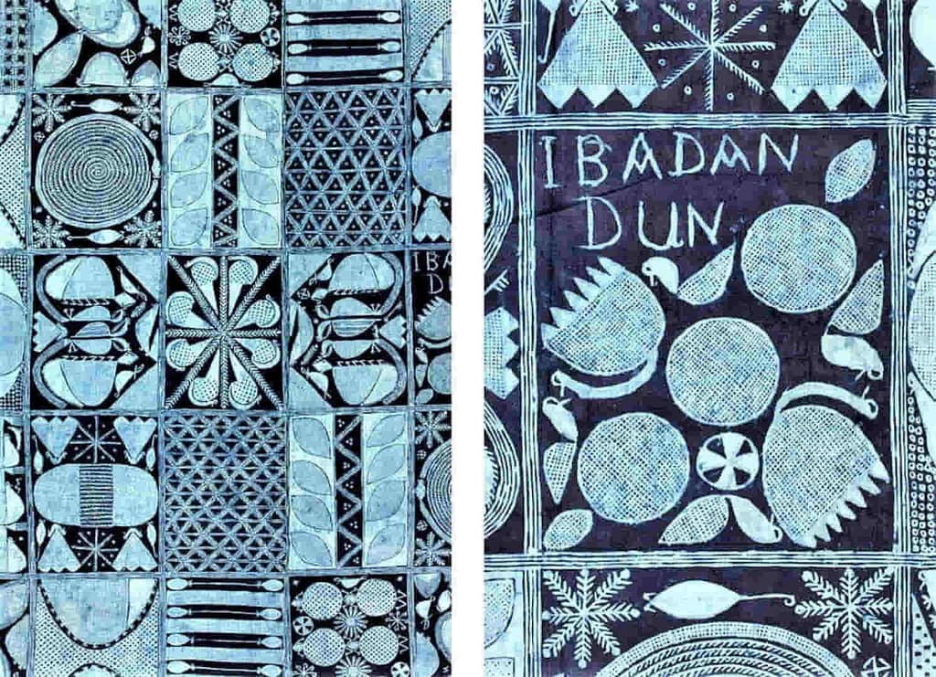 Ibadan fue el centro de producción de paños pintados a mano. Y para dejar constancia insertaban un ‘patrón de marca’ conocido como Ibadan Dun  o ‘Ibadan es bueno’ en Yoruba, aludiendo a los pilares de la Sala Mapo o Ayuntamiento de Ibadan, alternando con otros motivos.
