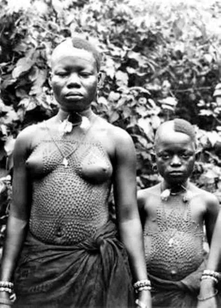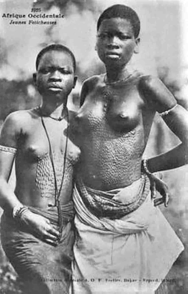 También es difícil ver las marcas de estas dos jóvenes Ashanti Akan en hombros y torso, pero sabemos que poco diferían de las de los pueblos con quienes convivían en una época convulsa, donde aún no estaba muy claro si la esclavitud estaba abolida y si ellos, y los blancos, eran conscientes de la prohibición firmada en las metrópolis y en qué consistía pues las plantaciones debían seguir siendo rentables. Era un tiempo en donde la escarificación era una defensa que los negros pensaban les eximiría de la esclavitud como sucedía en el siglo XVII.