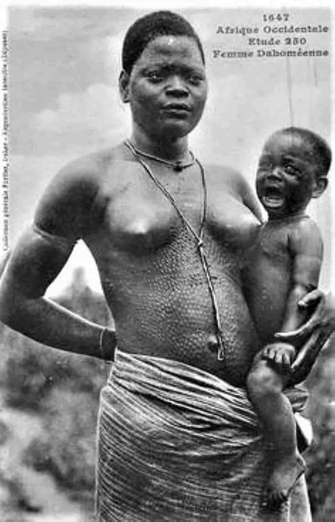 En origen sus habitantes eran Adja un grupo Ga,aunque luego se hicieron con el control los Fon y siempre a la sombra de los Yoruba de Nigeria, pueblos siempre imbricados pero distintos. Parecen pero no son iguales las escaras de los vientres de estas mujeres, pero tal vez se deba más a las manos que las realizaron.