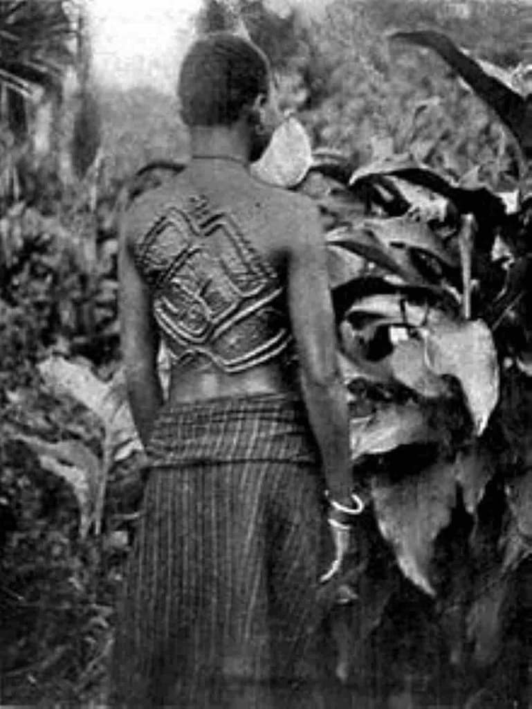 Al ser el Reino Kongo el más poderoso a pesar de sus vicisitudes, marcó diversas improntas que luego pueblos distantes pero no tan distintos, siguieron con sus particularidades. Estas fotos son elocuentes en cuanto a percibir que es y cómo se visualiza y distingue una escarificación; aunque verificando que son personas del Congo, enorme territorio equivalente al europeo, no supe durante años a que pueblo pertenecieron. Ahora sabemos que estos dos hombres pertenecían al pueblo Turumbu y que a este de abajo se le hizo una foto en 1910 por alguien de la expedición Stanley y Falls.