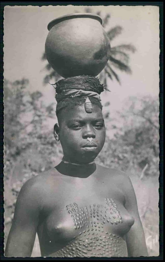 “Cuando la cortadura es vertical en la parte delantera de la cabeza y encima de la frente es señal de alguna sangría. Las sajaduras que algunos tienen en el cuello son señal evidente que padecieron escrófulas u otros tumorcillos, los cuales creen ellos que son la causa y principio de la enfermedad, y para verse libres se las hacen arrancar de raíz. A estos tumores que les salen en el cuello y parecen almendras o glándulas movibles, llaman bichikòbio tolo, glándulas de la enfermedad del Sueño”.