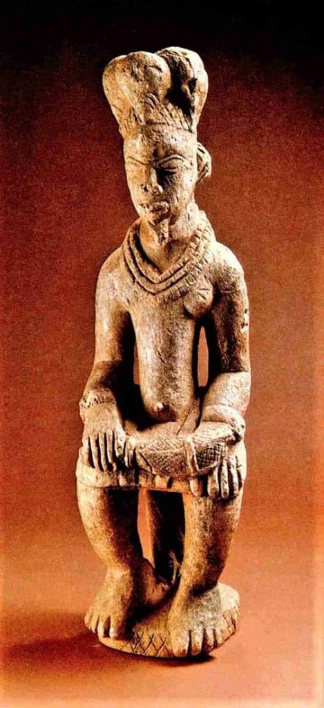 Junto a un trono de piedra al uso en Ife, vemos esta figura de Esie, en lo que no está claro si se sienta en un trono o un asiento de prestigio, tallada en esteatita, es una de las más de mil figuras 0 trozos más o menos grandes y dañados encontrados en la dicha ciudad de Esie. Las figuras tienen entre 30 a 60 cms. de alto, lo que hace que esta, de aproximadamente 76, cm. sea más alta que el promedio.