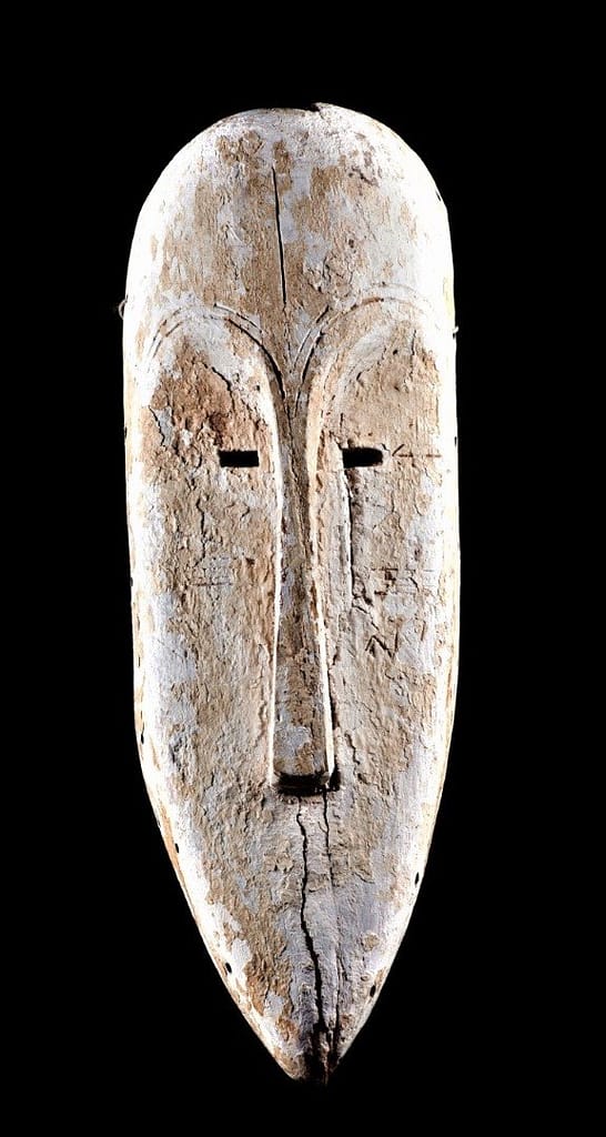 - 2ª: Máscara Ngil de los Fang Ntumu, Museo Etnológico de Berlín-Dahlem, Guinea Ecuatorial, antes de 1895, madera clara y caolín. Las escaras han sido pirograbadas.