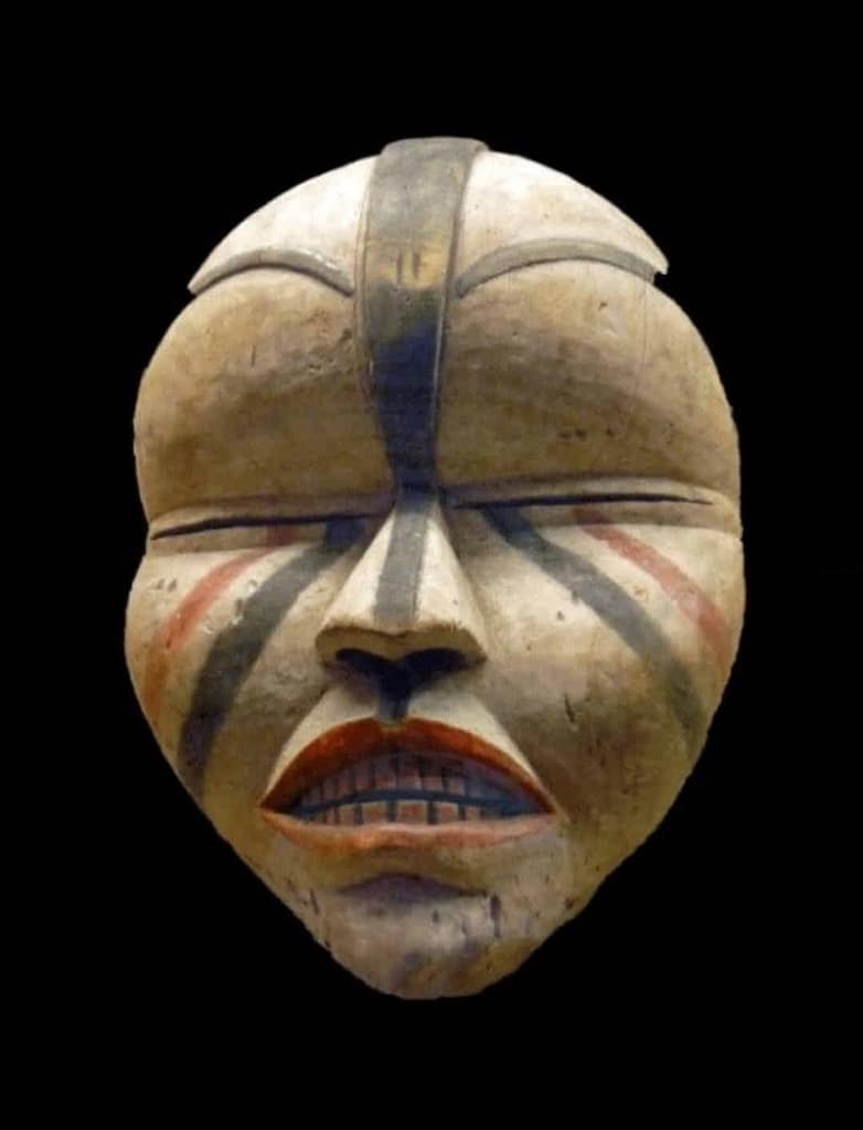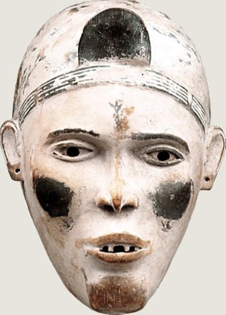 La máscara ngobudi de la derecha, nos muestra una mujer con estas atribuciones. Vemos en ámbas rasgos realistas y una expresión serena, y algo que guarda oculto incongruentemente, pues ngobudi significa algo pavoroso, un espíritu o poder que infunde pánico. El blanco, el color base de estas máscaras, simboliza los espíritus de los que han muerto y se asocia también a todo lo que tiene que ver con un nganga, como la justicia, el orden, la verdad, la sagacidad y la invulnerabilidad.