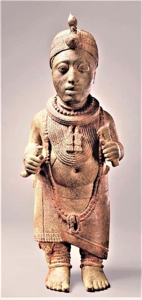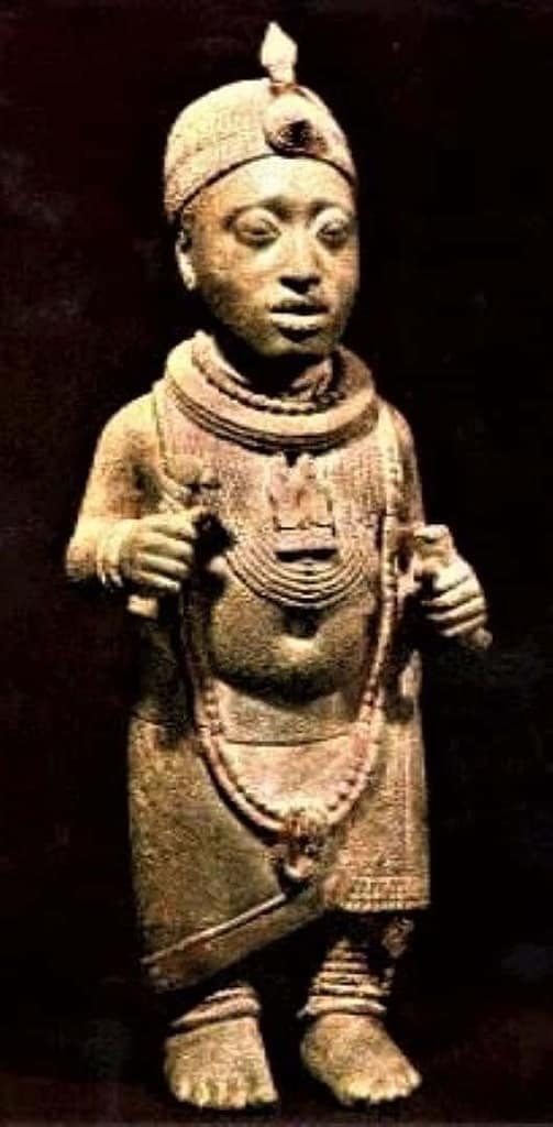 Es la representación en bronce de un rey de pie, conceptuada por los expertos como pieza excepcional de la escultura de Ifè, fuera de las cabezas.
