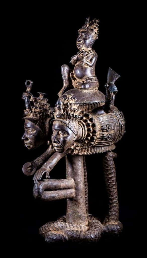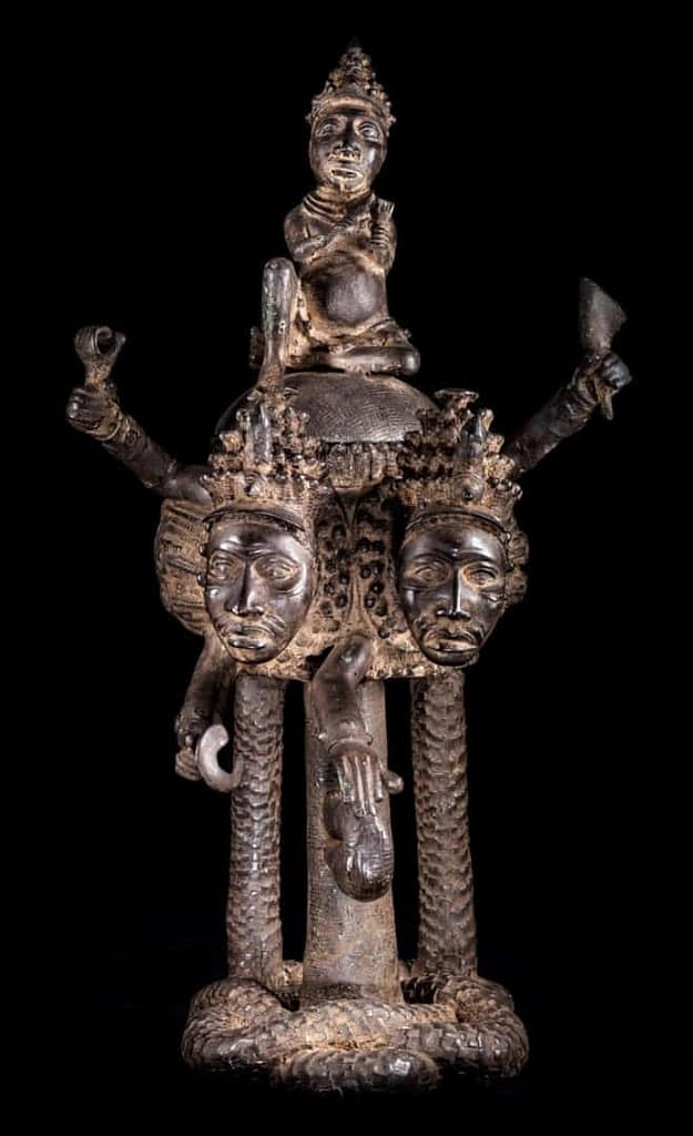 Este es un hermoso recipiente de estilo Ifè. Bronce, aleación de latón cobre y zinc; del siglo XIX; una altura de 80 con tapa, sin 60,9 x 43 x 46,5  cm. Pertenece a nuestra colección personal. Vemos dos personajes, sin duda relevantes, que como en el anterior circundan abrazando un recipiente sobre cuya tapa hay un rey. Todo ello está soportado por una serpiente que forma una especie de uroboro.