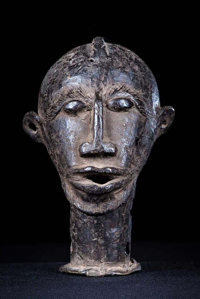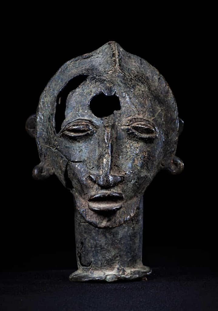 “Tales retratos no solo presentan la efigie del personaje, sino que se componen de un grupo de hasta veinte figuras en bronce, que representan a los criados y músicos del Mogho Naba, que se disponen en círculo alrededor de la figura ecuestre central del jefe, a veces fundida en plata.