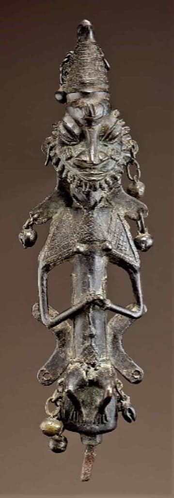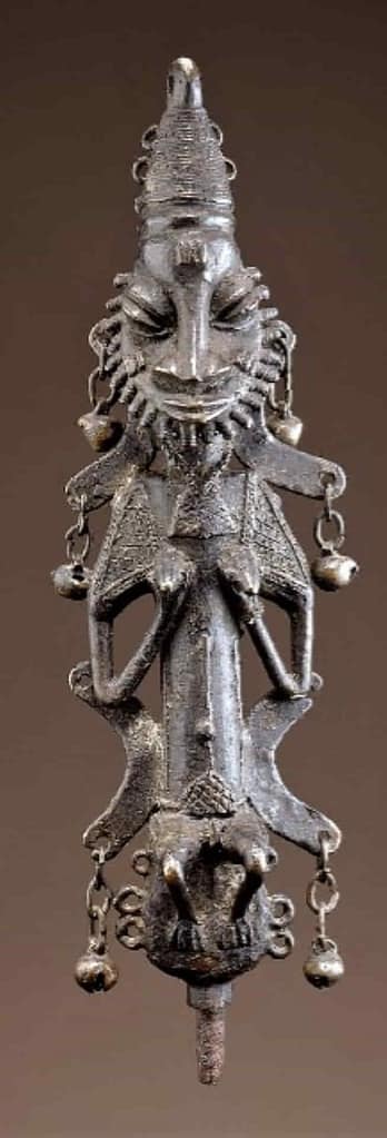 Sociedad Ogboni. Región de Ijebu, Nigeria. Comienzos siglo XX. Aleación de cobre, hierro. Medidas: 31 x 8.7 x 5 cm Donación de Deborah y Jeffrey Hammer al Museo Nacional Smithsoniam de Arte Africano.                           Nº rg: 94-19-1.1 y 2.
