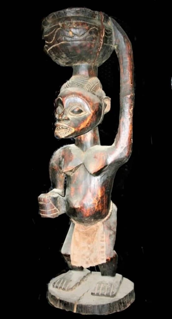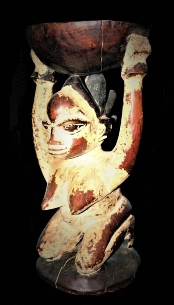 Estas figuras para santuario a veces sostienen cuencos para ofrecer nueces de cola u otro presente. Esta pieza, según la inscripción de una foto de Kenneth Murray de 1948, fue un regalo para Oko, un orisha de la fertilidad muy venerado en Oyo. Se cree fue hecha por un artista de Irawo, antiguo pueblo cercano a Oyo. Parece que además del bebe que la mujer genuflexa lleva a la espalda, había otros dos cada uno a un lado. Se piensa que el cuenco tenía una tapa con un ave encima. Y que el trabajo pretendía resaltar el poder de algún orisha que propiciaba fertilidad y partos exitosos.