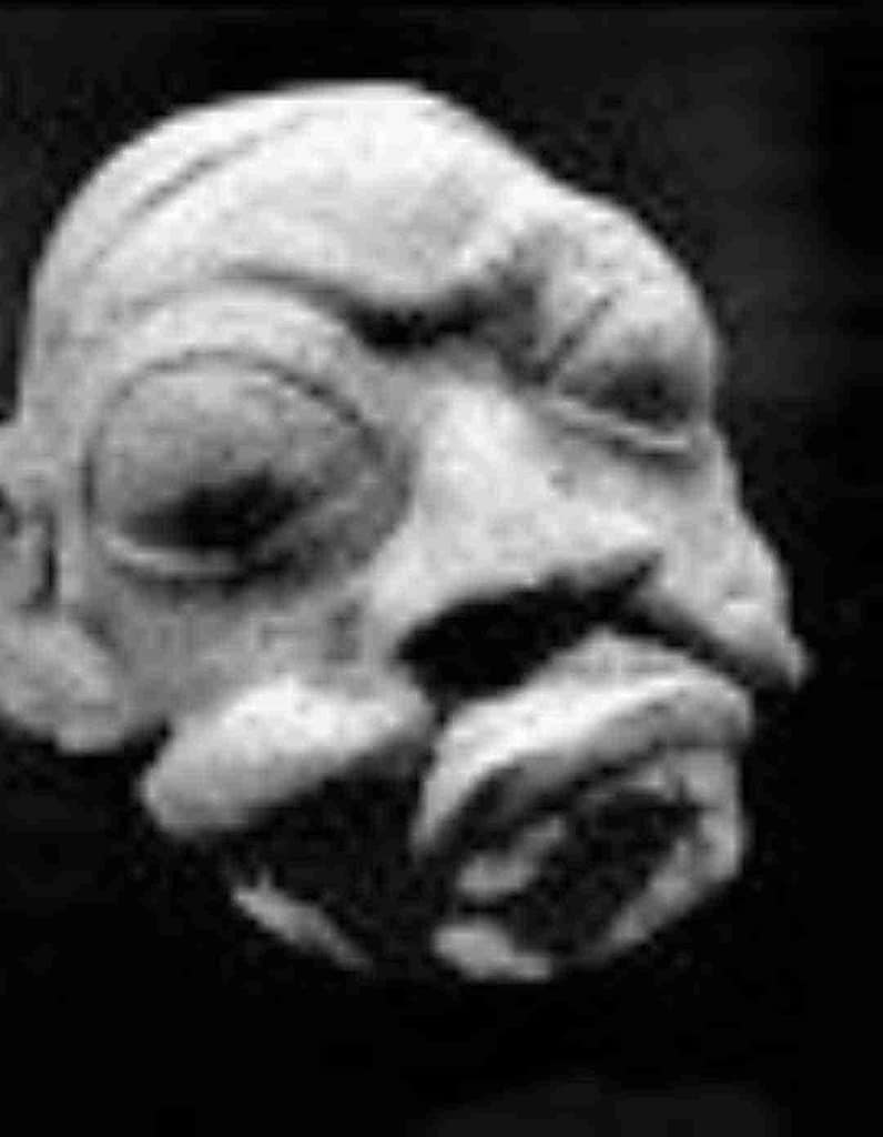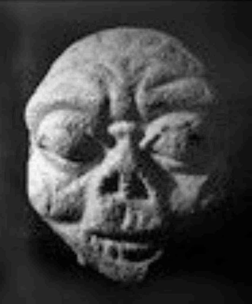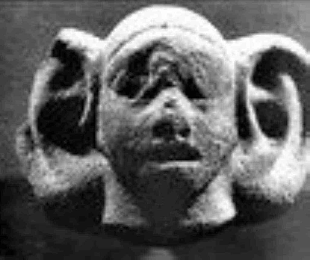 En la llamativa terracota de la foto 26 encontrada en la excavación de Obalárá zona de Ife, datada entre los siglos XIII y XIV, podemos observar un colgante alrededor del cuello con un cráneo y la cara fruncida ostensiblemente, con la boca abierta mostrando la lengua.