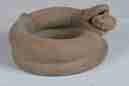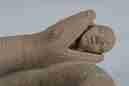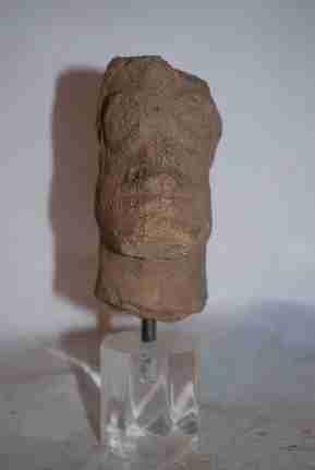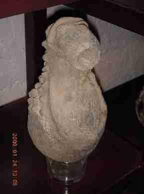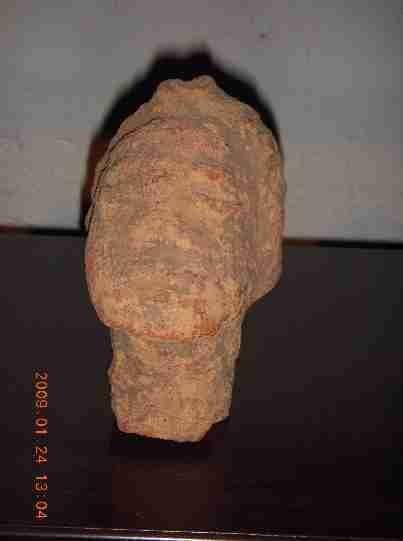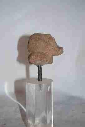 Mantiene restos de engobe rojo y es de destacar dentro de lo esquemático de la pieza, la amplia y longilinia boca, la protuberante y poderosa nariz y el tratamiento de los ojos. Fue recogida en la villa de Thial en Natamato.