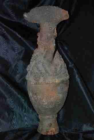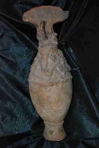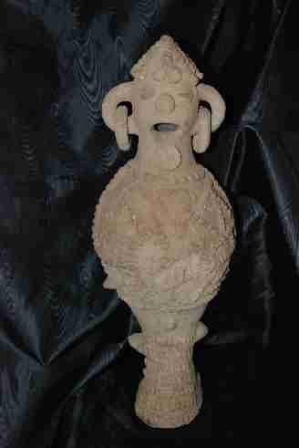 En barro cocido, con forma de campana alargada, estas piezas nos hablan con su decoración exterior, del estatus que ostentaba el personaje allí enterrado.