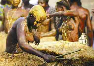 Untado el cuerpo con aceite de palma, se impregnan de polvo de ocre amarillo como símbolo de conexión con sus difuntos y buscar la reconciliación. . .